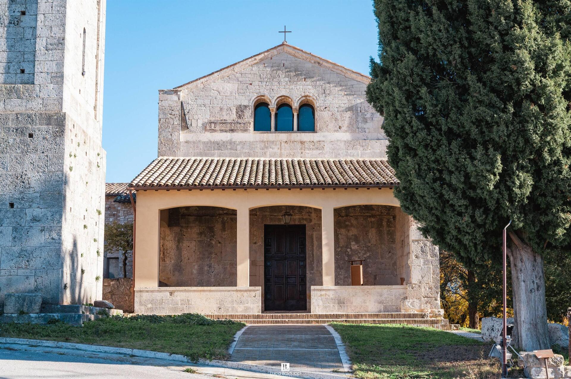 Curiosità: guardando attentamente la facciata, a destra della trifora si potrà notare un’epigrafe con l'iscrizione di Lucius Julius Marcianus e di sua moglie Publicia, di evidente riutilizzo romano, a sinistra un frammento di fregio dorico con metope a rosette e bucrani. Molti reperti antichi si trovano inglobati anche nelle altre chiese ed abbazie della zona, dove è frequente la pratica di utilizzare materiale di spoglio proveniente dai preesistenti edifici romani.